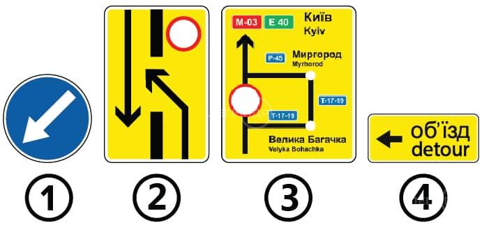 Який із зображених дорожніх знаків показує напрямок об'їзду закритої для руху ділянки проїзної частини на дорозі з розділювальною смугою?