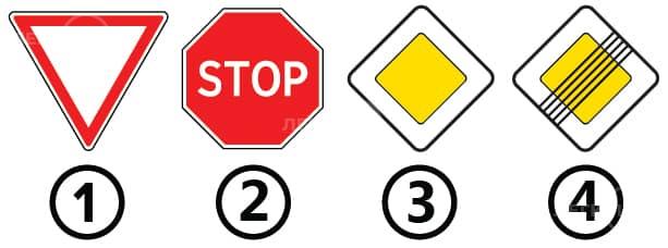 Який із зображених дорожніх знаків надає першочергове право проїзду перед транспортними засобами, що рухаються по дорозі, яка перетинається, на нерегульованих перехрестях?