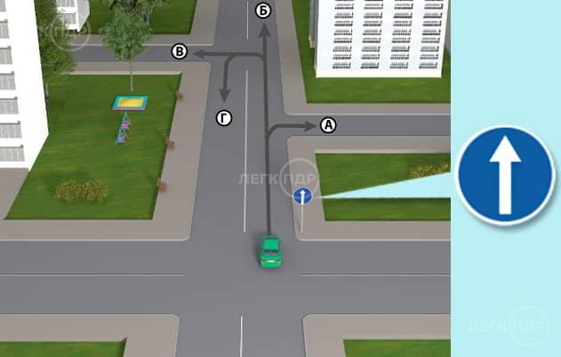 У якому напрямку водієві зеленого автомобіля дозволено рух у зображеній ситуації?