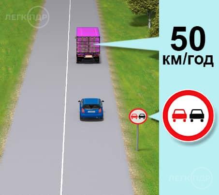 Чи дозволено водієві синього автомобіля виконати обгін вантажного автомобіля, що рухається зі швидкістю 50 км/год.?