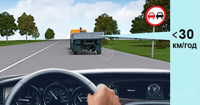 Чи дозволено Вам у даній ситуації виконати обгін вантажного автомобіля з причепом, що рухається зі швидкістю менш ніж 30 км/год.?