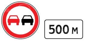 За якої з умов дозволено виконати обгін транспортного засобу після проїзду зображеного дорожнього знака, встановленого з табличкою?