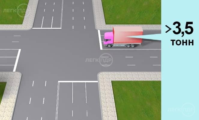 У якому напрямку дозволено рух на перехресті водієві вантажного автомобіля з дозволеною максимальною масою понад 3,5 т?