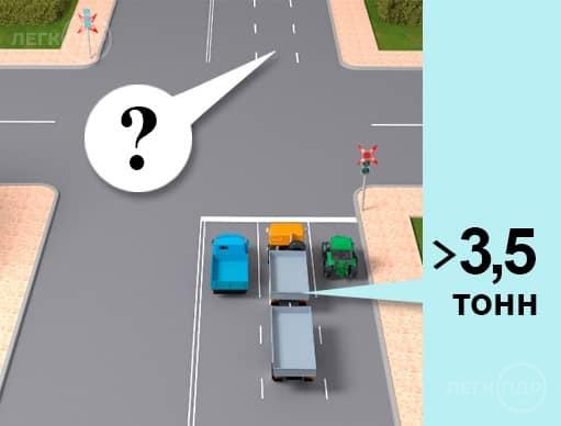 Хто з водіїв вантажних автомобілів із дозволеною максимальною масою понад 3,5 т і трактора правильно зайняв смугу для руху прямо?