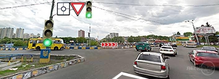 Водій сірого автомобіля здійснює в’їзд на перехрестя з круговим рухом. Чи потрібно в такому випадку вмикати лівий покажчик повороту?