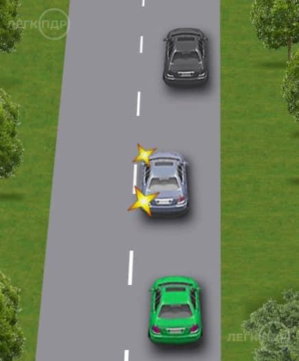 Чи може водій зеленого автомобіля почати обгін сірого автомобіля?