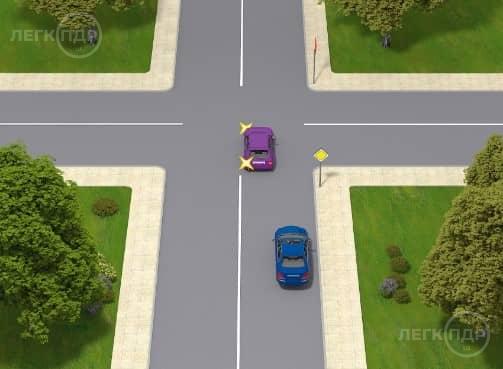 Як повинен вчинити водій синього автомобіля, що рухається прямо, у даній ситуації?