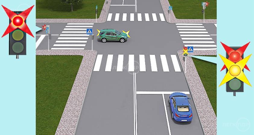Як повинен вчинити водій синього автомобіля у разі ввімкнення зеленого сигналу світлофора?