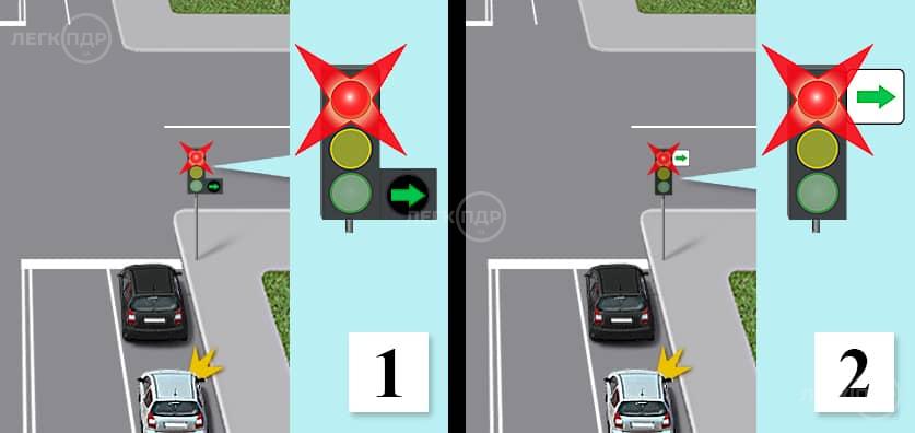 На якому малюнку водій чорного автомобіля, який зупинився на заборонний сигнал світлофора, щоб потім їхати прямо, обов`язково повинен продовжити рух праворуч (у напрямку стрілки), коли транспортний засіб, що наближається ззаду, подав сигнал повороту праворуч?