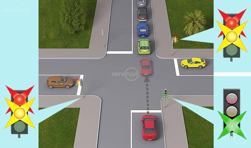 Чи дозволено водієві червоного автомобіля виїхати на перехрестя на зелений миготливий сигнал світлофора, якщо за перехрестям утворився затор і йому буде потрібно зупинитися на перехресті?
