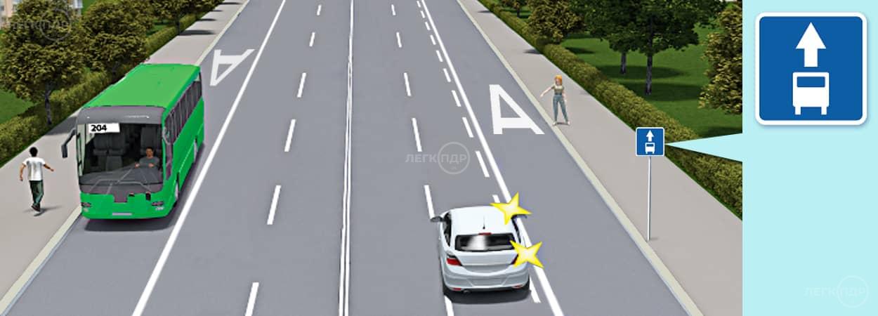 Чи має право водій білого автомобіля в даній ситуації виїхати і зупинитися на смузі для маршрутних транспортних засобів для посадки пасажира?